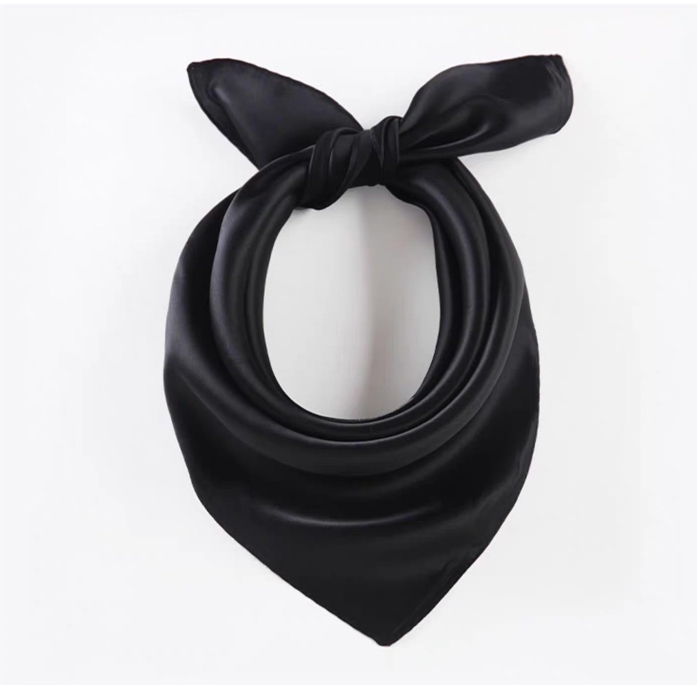 A square, solid-colored silk scarf is a stylish and versatile accessory, perfect for both formal and casual occasions. A silk scarf feels luxurious and soft on the skin, while the square shape offers various ways to wear it, such as around the neck, in the hair, or as an accessory on a bag.